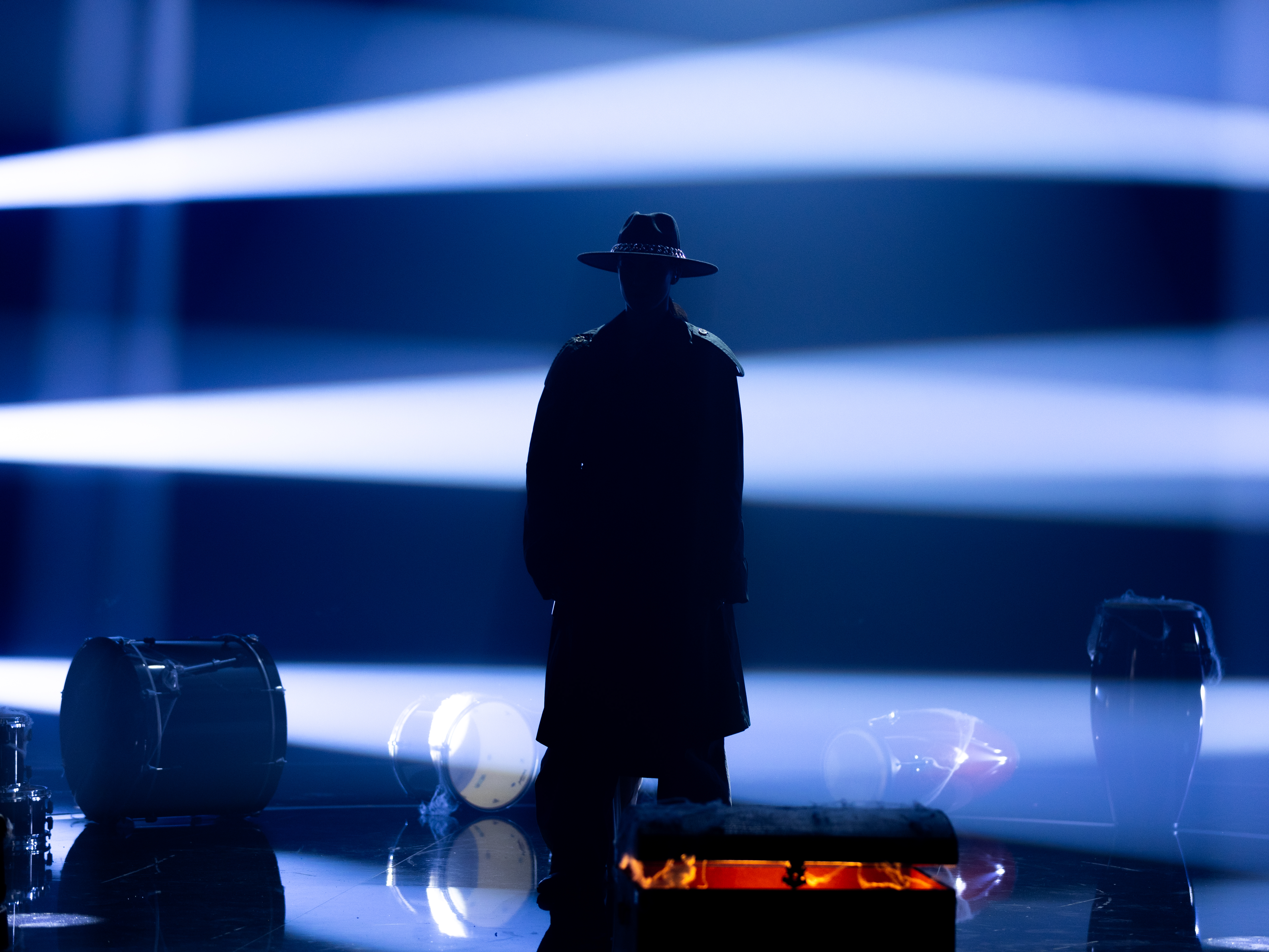 The complex script is accompanied by scenes on led screens showing Hera trying to touch herself in a mirror surrounded by a scenography made of scattered drum elements under a cobweb, in some imaginary abandoned place.